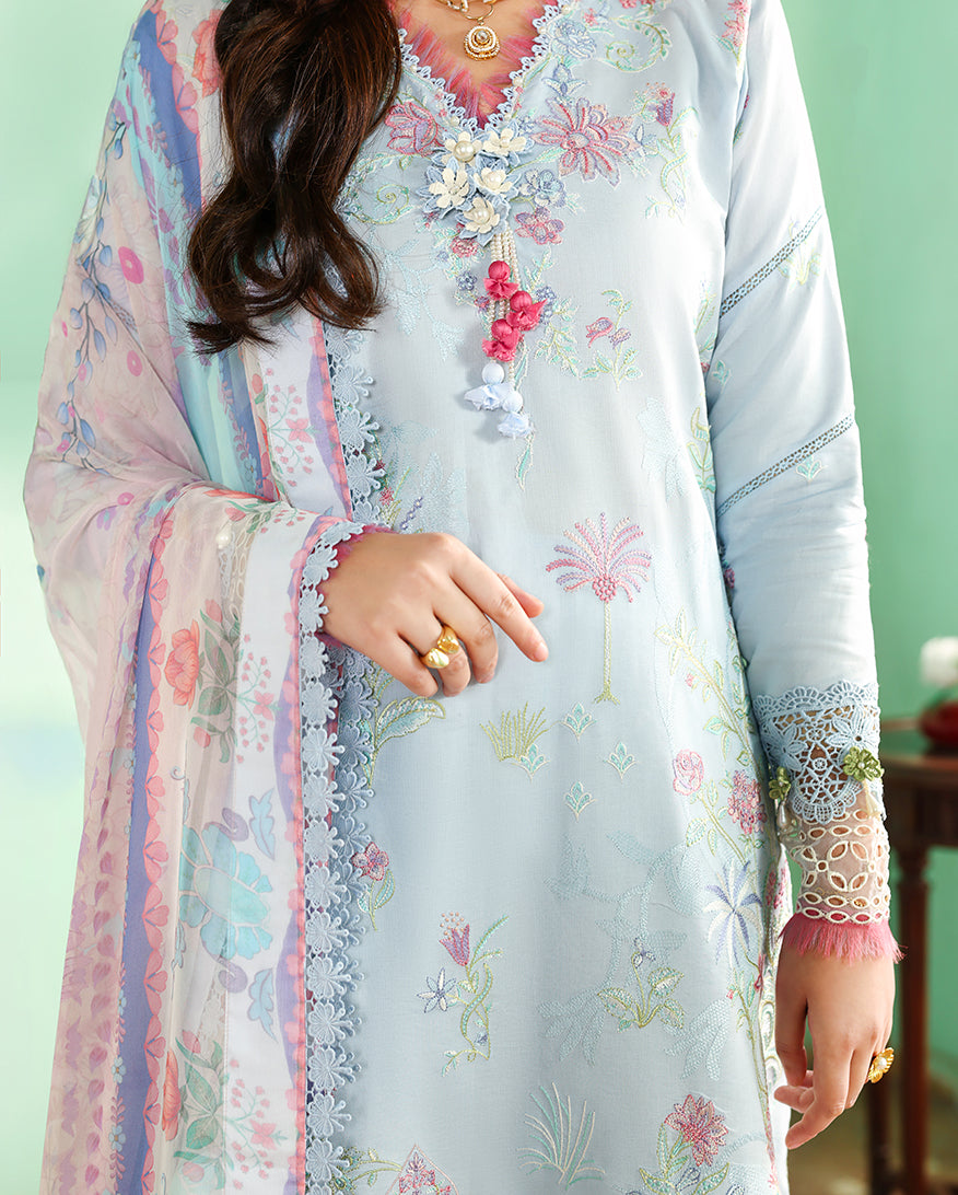All laces used for finishing of the stitched outfit especially the dupatta or trousers may vary from the shoot.